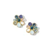 Often inspired by the elegance of natural world, Ippolita designed these cluster earrings to resemble blooming flowers. Hand-cast from 18K gold, the pair is set with faceted drops and rounds of Swiss blue topaz, light iolite, London blue topaz, blue topaz, ice quartz, mother-of-pearl, and a doublet of rock crystal over larimar, in a mix of bezels and prongs.